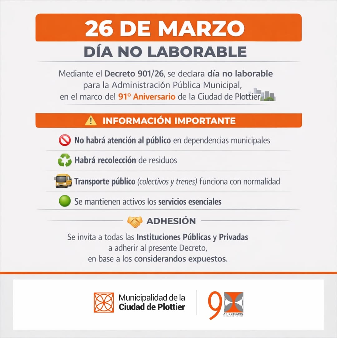 Asueto administrativo por el Aniversario de Plottier