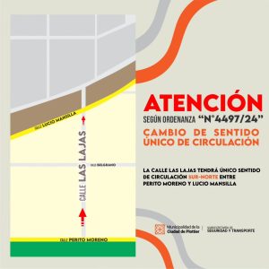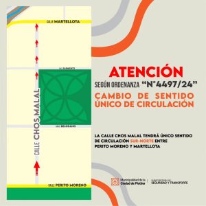A partir del 23 de diciembre, según Ordenanza N° 4497/24, se implementarán cambios en el sentido único de circulación en las siguientes calles: Calle Chos Malal: Sentido Sur-Norte, calle Lacar: Sentido Norte-Sur y calle Las Lajas: Sentido Sur-Norte.