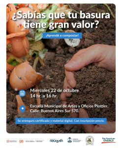 La Municipalidad de Plottier invita a toda la comunidad a participar del Taller de Educación Ambiental, el miércoles 22 de octubre, de 14:00 a 16:00