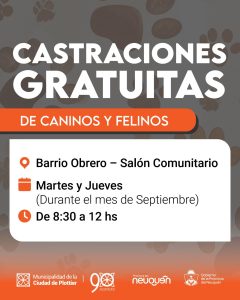 La Municipalidad de Plottier, a través de la Dirección de Zoonosis, informa que continúan las castraciones gratuitas de caninos y felinos en el Salón Comunitario
