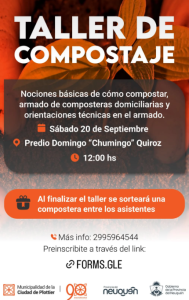 El sábado 20 de septiembre, se llevará adelante el taller gratuito y con inscripción previa, de compostaje a partir de las 12 hs en el